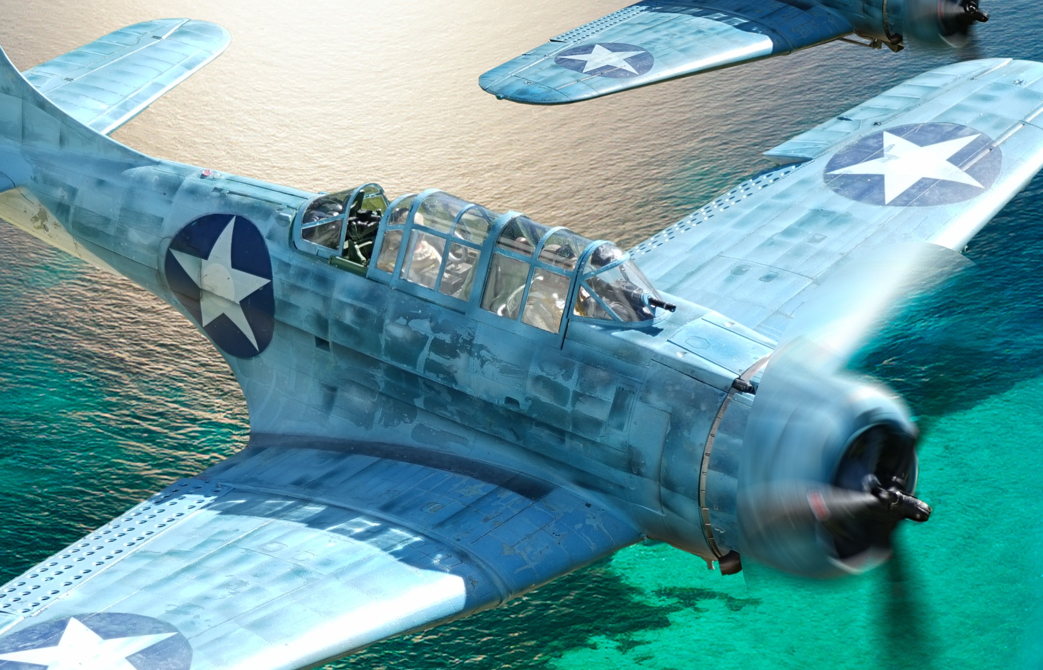SBD-5 Squadron Soaring Over Crystal Clear Skies and Turquoise Waters